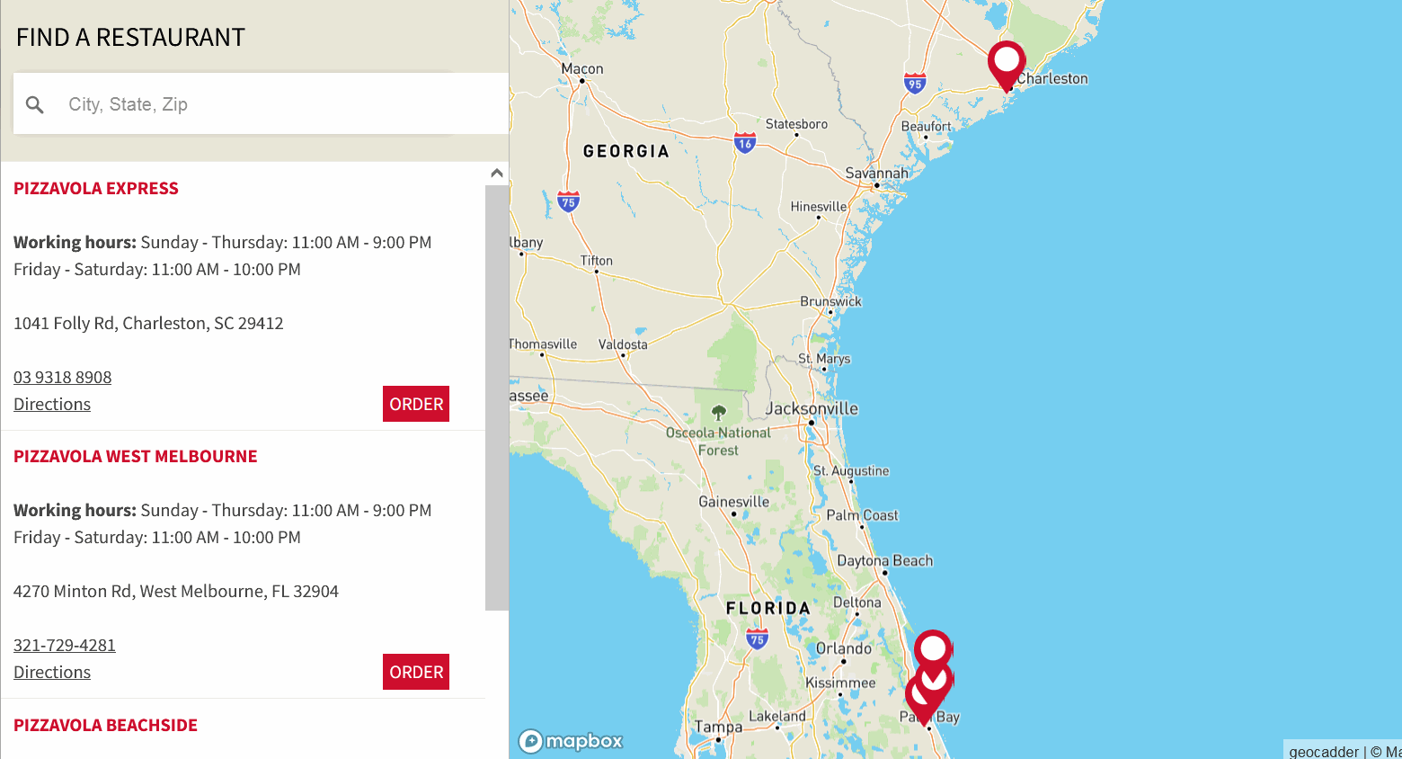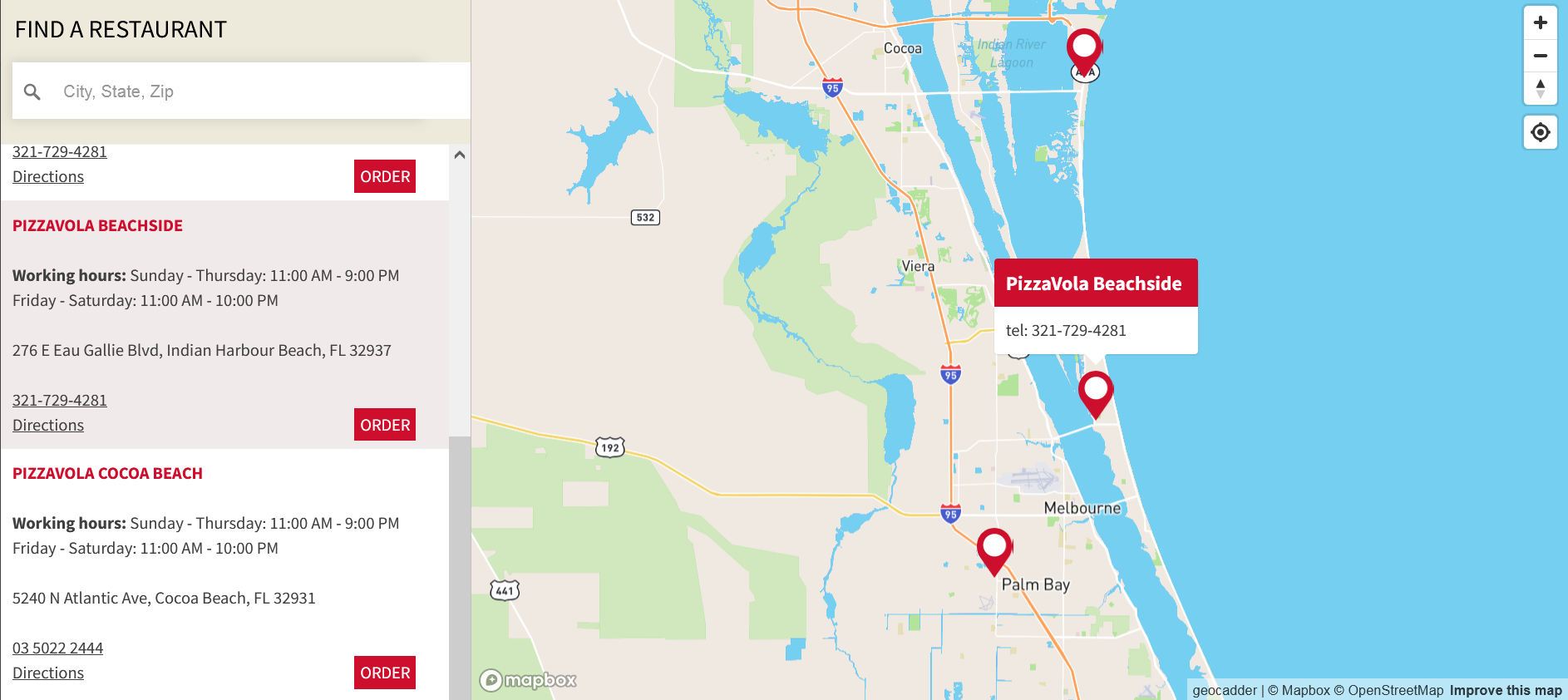 Интерактивна карта, показваща местоположението на ресторанти и тяхното разстояние до адрес, потърсен от потребителя.